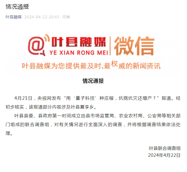 4月21日,央視網發布“用‘量子科技’種莊稼,抗病抗災還增產?”報道。經初步核實,該報道部分內容涉及葉縣夏李鄉。