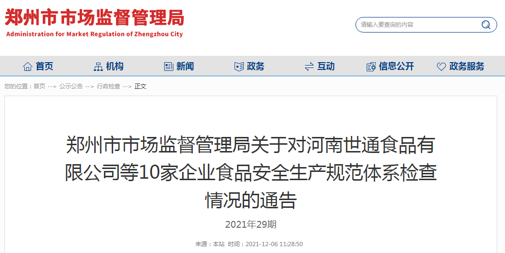 12月6日,鄭州市市場監督管理局網站發布關于對河南世通食品有限公司等10家企業食品安全生產規范體系檢查情況的通告(2021年29期)。