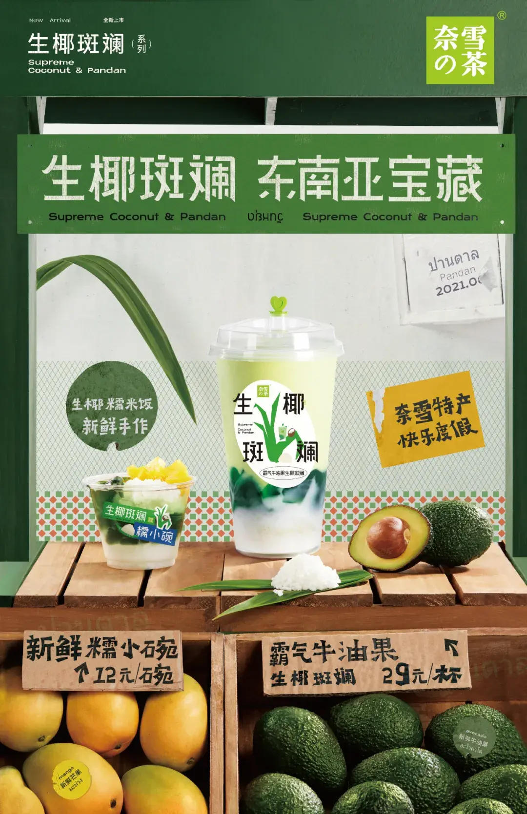 今夏茶飲盛行“南洋風”,如泰綠、泰紅,或是以香茅(即檸檬草)為原料的檸檬茶等,突出異域風味。奈雪的茶則用了另一款南洋香料——斑斕葉(即香蘭葉),獨樹一幟推出霸氣牛油果生椰斑斕。