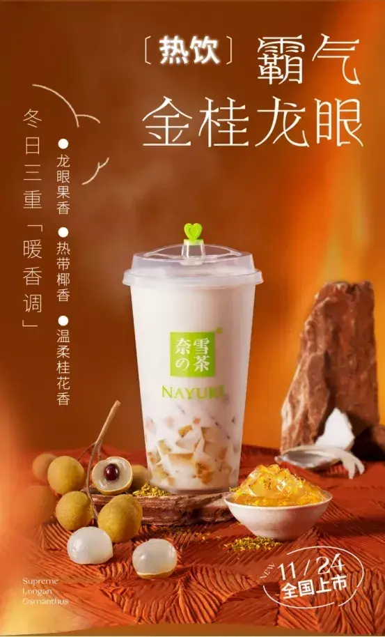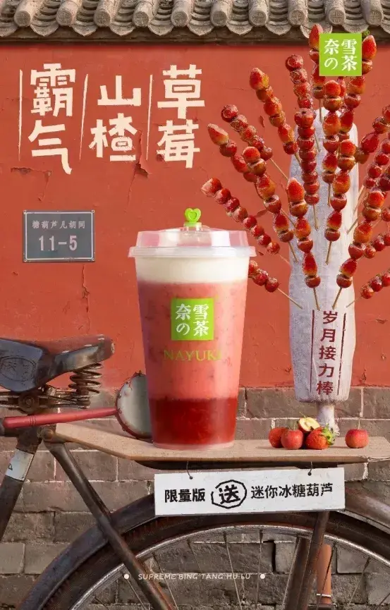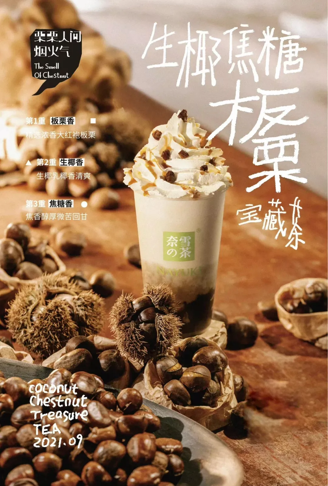 冰糖葫蘆、糖炒板栗,都是當下消費者童年時代常吃的甜食。入秋以后,奈雪推出可以喝的冰糖葫蘆、可以喝的糖炒板栗,則是讓人記憶中的色彩鮮活起來。山楂搭配草莓,是似曾相識的甜酸;板栗融合生椰,是意料之外的香濃。