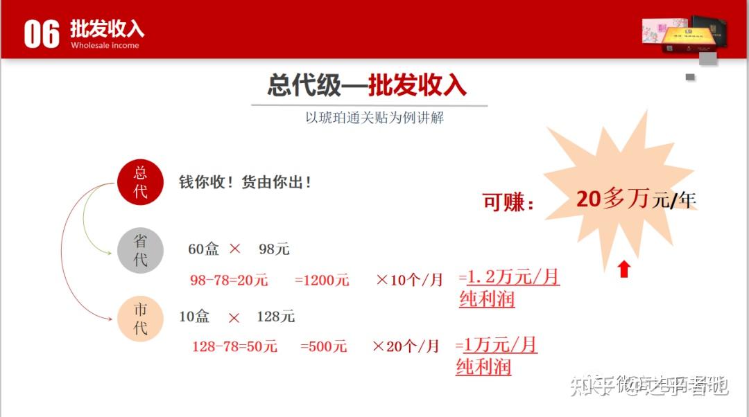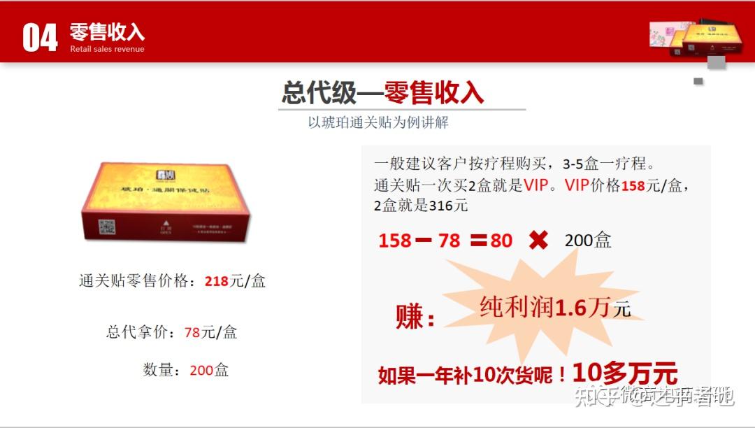 首先是零售收入,以琥珀通關貼為例,零售價格為218元每盒,董事級別代理拿貨價為60元每盒,一般建議消費者按療程購買,3至5盒為一療程,一次買2盒就是VIP,VIP的價格為158元每盒,這樣一來董事每賣出一盒產品,就可以獲得90元的差價利潤。同樣的計算規則,總代每賣出一盒產品,可以獲得80元的差價利潤。