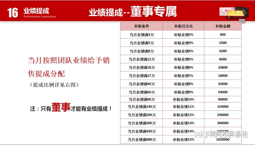 代理商們極力推薦人們直接做總代,原因是總代距離最高級別董事最近,通過發展團隊就能免費成為董事,上到董事級別后,可以享受月度提成,按照當月按照團隊業績給予銷售提成分配,詳情見上表。馮女士算了一筆賬,一名董事一年下來的收入可以達到165萬元,并且說,只要團隊在不斷裂變,收入就會越來越多。