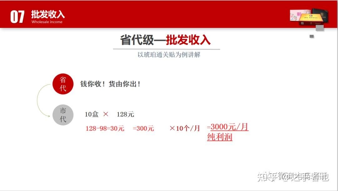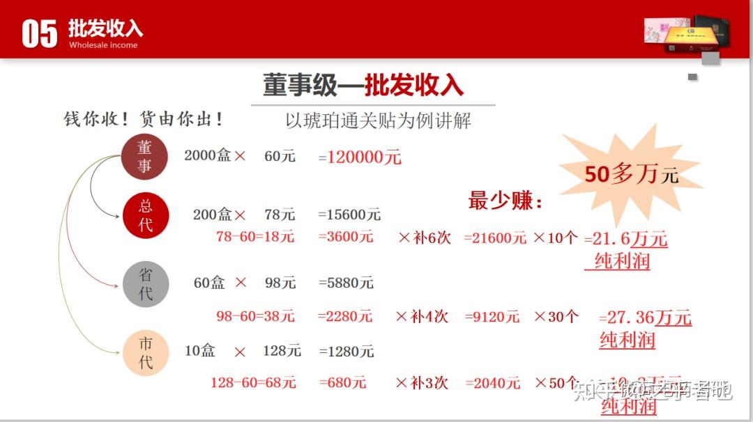 第二個獎勵是批發收入,其實更像是推薦獎。董事發展一個總代,可以獲利3600元,發展一個省代可以獲利2280元,發展一個市代可以獲利680元。總代發展一個省代獲利1200元,發展一個市代獲利500元,省代發展一個市代可以獲利300元。