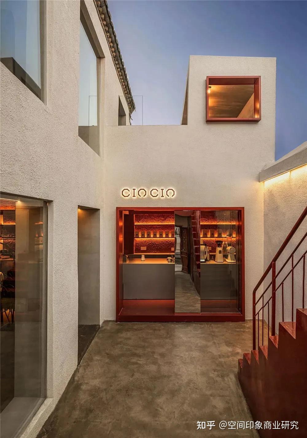 內院的深灰色水泥地面延續了街道的感覺,白色的外墻搭配紅色的門頭,紅色樓梯如一座天橋連接至二樓。紅色作為Cin Cin品牌的VI視覺主色,在這里既強調了空間的主動線,也體現了空間的視覺趣味性。