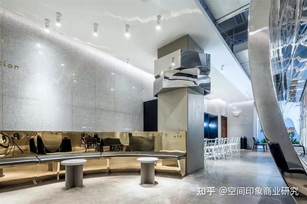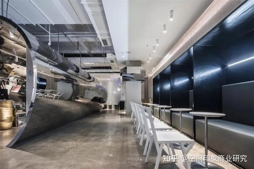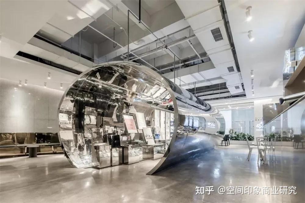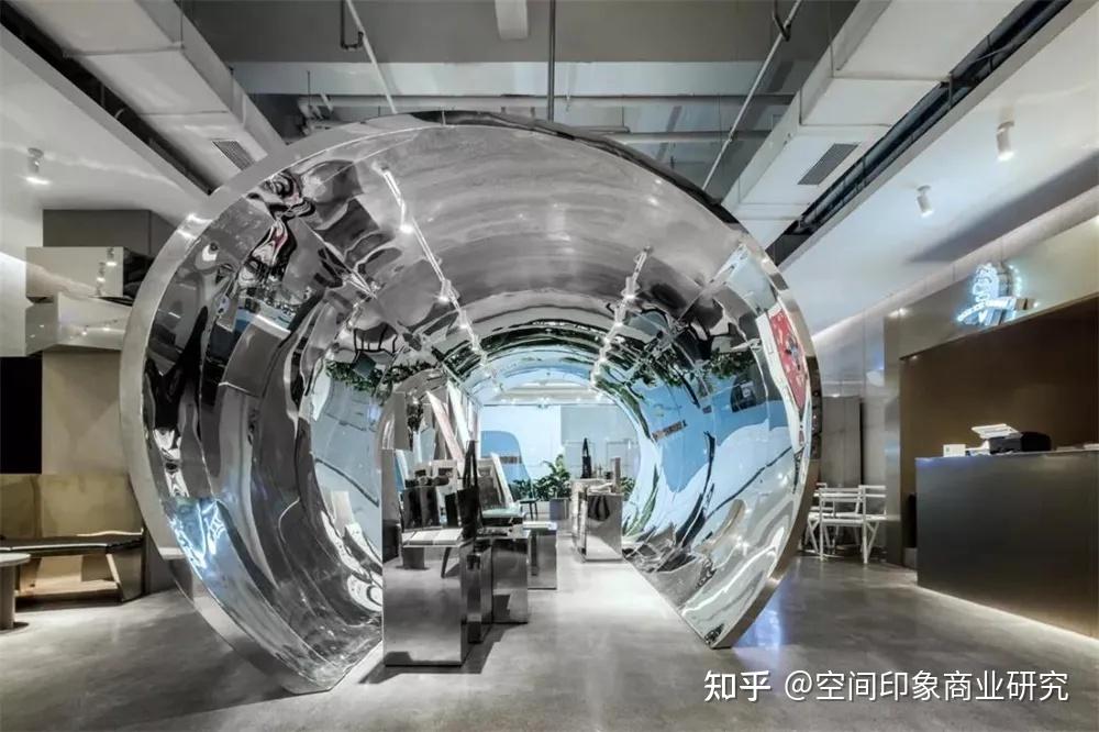最吸睛的是店內的一條全金屬質地的銀鏡通道,設為“周邊實驗室”,是全店的核心,充滿未來感、科技感。