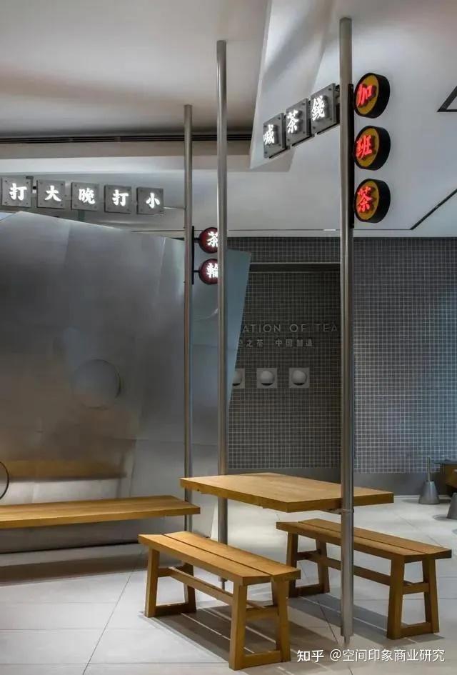 設計師把成都茶館最有特色的俚語,以可視、可憶的燈箱形式穿插在整個空間中。如:“茶輪”“板凳戲”“喝加班茶”“喊茶錢”“擺龍門陣”“胡了”,這些傳統記憶通過信息的重復輸出,把這些即將失去的地域特色文化重新植入到消費者內心中。這正是成都被時代潮流沖淡的那“煙火氣息”的延續。