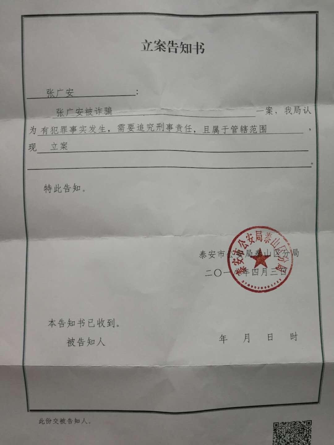 山東泰安市公安局泰山區分局已為報案人張廣成立案