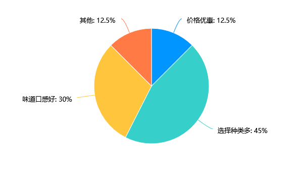 選項小計比例價格優惠1012.5%選擇種類多3645%味道口感好2430%其他1012.5%本題有效填寫人次80