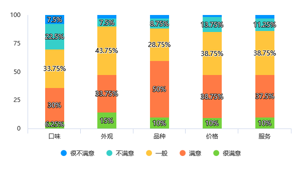 題目\選項很不滿意不滿意一般滿意很滿意口味6(7.5%)18(22.5%)27(33.75%)24(30%)5(6.25%)外觀2(2.5%)6(7.5%)35(43.75%)27(33.75%)12(15%)品種2(2.5%)7(8.75%)23(28.75%)40(50%)8(10%)價格1(1.25%)11(13.75%)31(38.75%)31(38.75%)8(10%)服務2(2.5%)9(11.25%)31(38.75%)30(37.5%)8(10%)