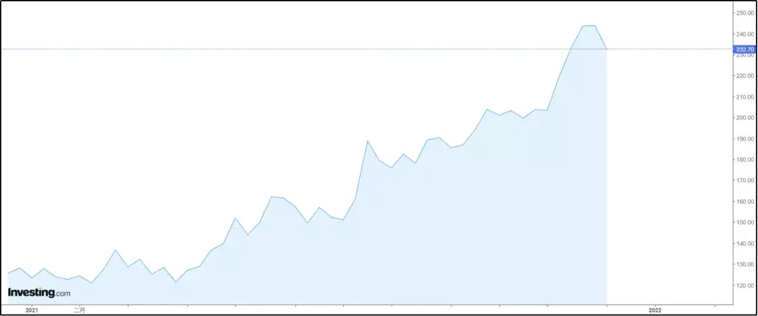 2021年以來阿拉比卡咖啡期貨價格走勢不斷攀高:今年阿拉比卡咖啡期貨價格最高到達250美分/磅,成為近10年來的最高水平。