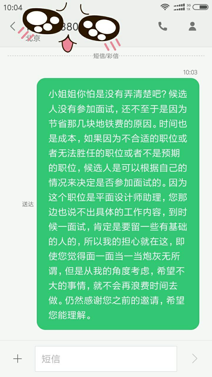 今天下午去面試了一個類似于事業單位的那種,其實上個星期四去面試過,兩天人面試,其中一個女的全程頭也沒抬,應聘行政內勤的,招聘信息上的崗位職責并不難,我覺得可以才投的簡歷,過了幾天沒有音訊,昨天突然通知去復試,復試又是一個眼鏡女,除了我和她辦公室還坐了兩個女的,沒錯,他們只有一間辦公室,只有三臺電腦,據我目測至少五個人共用,辦公室也很小,那個女的居然問我職業規劃是什么,為什么要選xx,xx,xx這三中職業類型,說實話才剛畢業,我現在對未來并沒有很清晰的職業規劃,不都是在摸著石頭過河嗎?只有試過了才知道自己適合什么啊,而且那三種類型是網站注冊投簡歷時必須選的,我覺得自己做這些都可以就選了,沒有什么特殊的理由。以及假如我是12580客服,遇到客戶說手機停機沒給提醒來鬧事怎么辦。各種問題,這跟我同學參加公務員考試時候的問題差不多,她那時候經過培訓得知的標準答案基本就是各種請示領導踢皮球,總之我并沒有回答的令她滿意,最后說發郵件給我布置應用文作業,最后問我有什么問題我也懶得問了。假如給我發郵件我只想告訴她,如果當時覺得專業不對口或者不能勝任就不要通知面試復試,虧我還早到半個小時,我的時間就不寶貴了嗎,都到了復試環節我以為就到了說工作職責和薪資待遇,雙方都覺得OK就留下,不行拉倒,況且她那個崗位要求我真想覺得沒有什么很大的難度。然而并不是,面試的居然還是初試的問題。單就工作內容來說,真沒有那么復雜,我也是權衡之后才投簡歷的,難道就因為是類似于事業單位才這樣驕傲嗎?在面試期間有一個同樣來面試的女孩敲門,里面的人頭都不抬一下直接讓去外面等。另,我只想知道12580有提醒停機這個業務嗎?