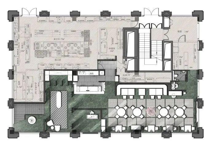 △石庫門記憶|老上海的石庫門文化石庫門文化孕育并滋養了上海近代文明,甚至可以說是一種近代上海的文化象征 。設計師將石庫門定為此包間的設計主題,翻模雕琢定制了整面石庫門浮雕,使其成為室內軟裝的一部分,去致敬未來考古主義藝術的表達。