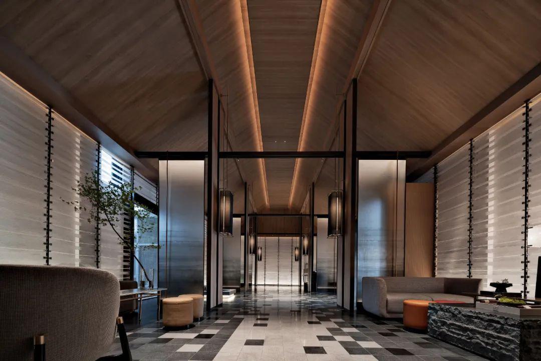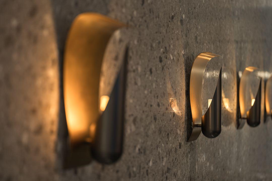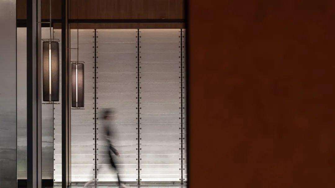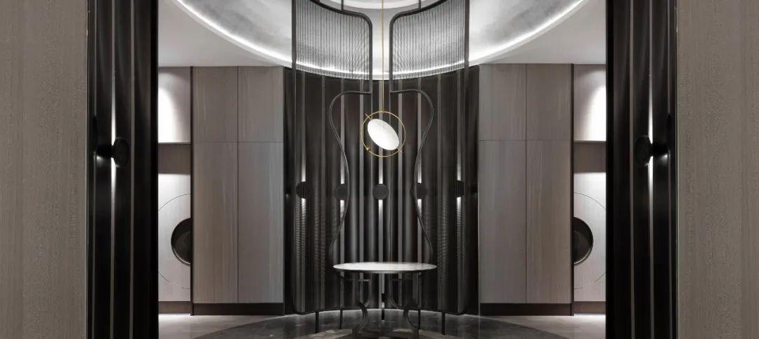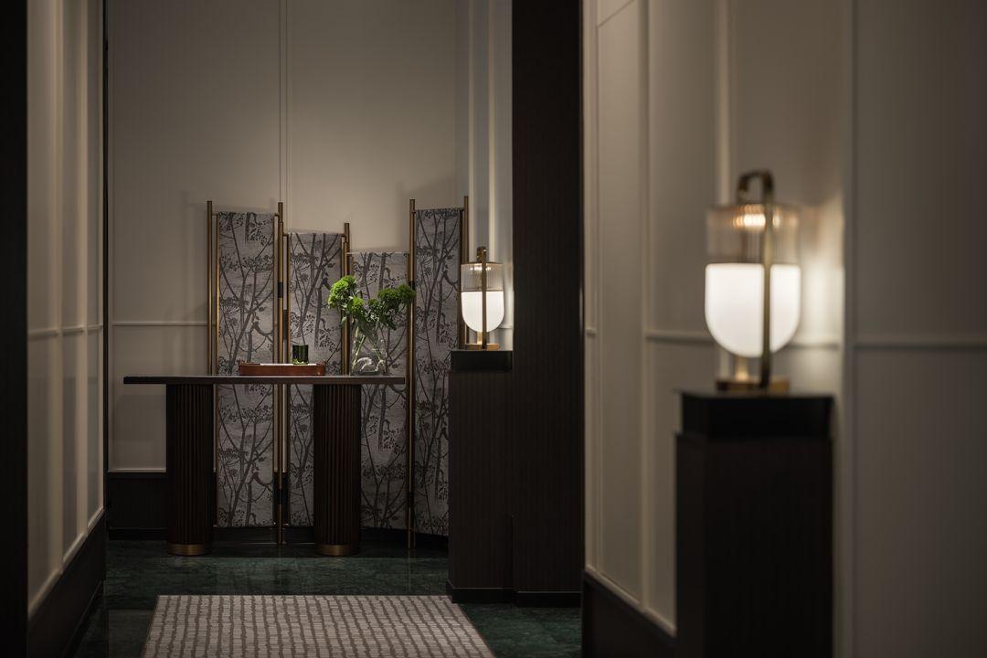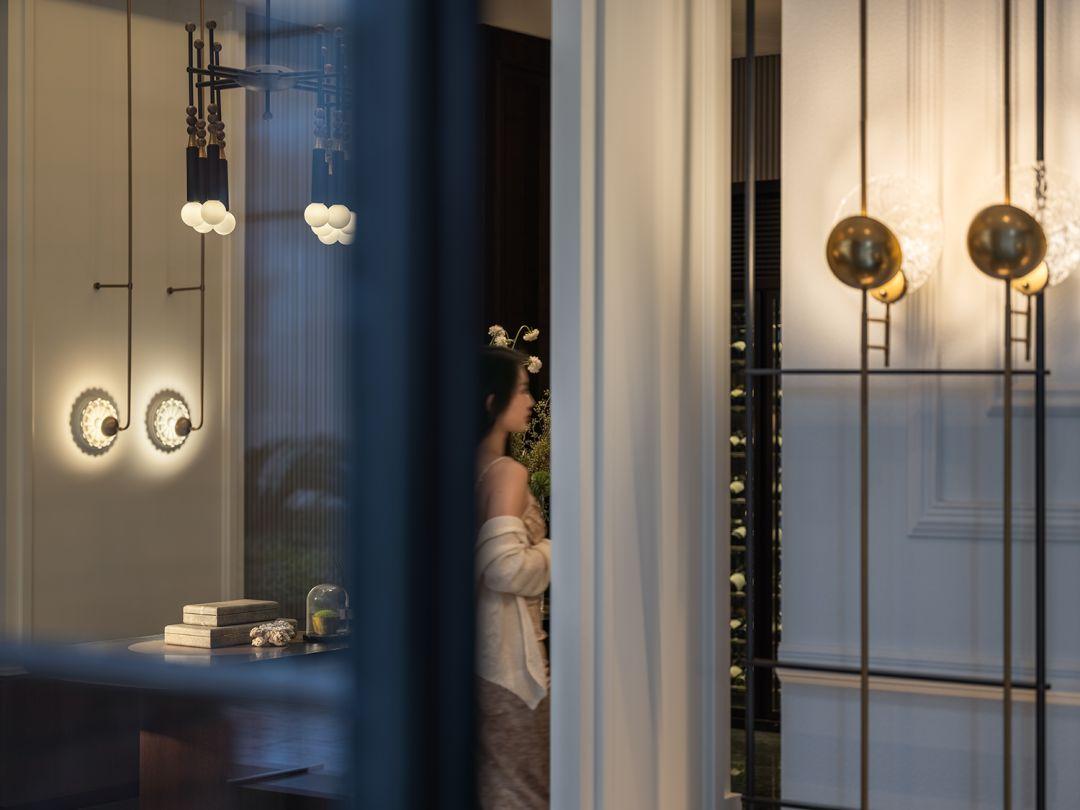 流轉的門廳是光與影的游戲之所。寒夜中賴以溫存的迷人溫度,來源于食物,也來自于暖調的輝光。華麗奢侈的細節之美,便也多了些人間煙火氣息。設計師用灰調的木、富有雕塑感的多款壁燈來詮釋「光」的主題,引導賓客前往用餐的動線,也呼應那一縷期待的雀躍。