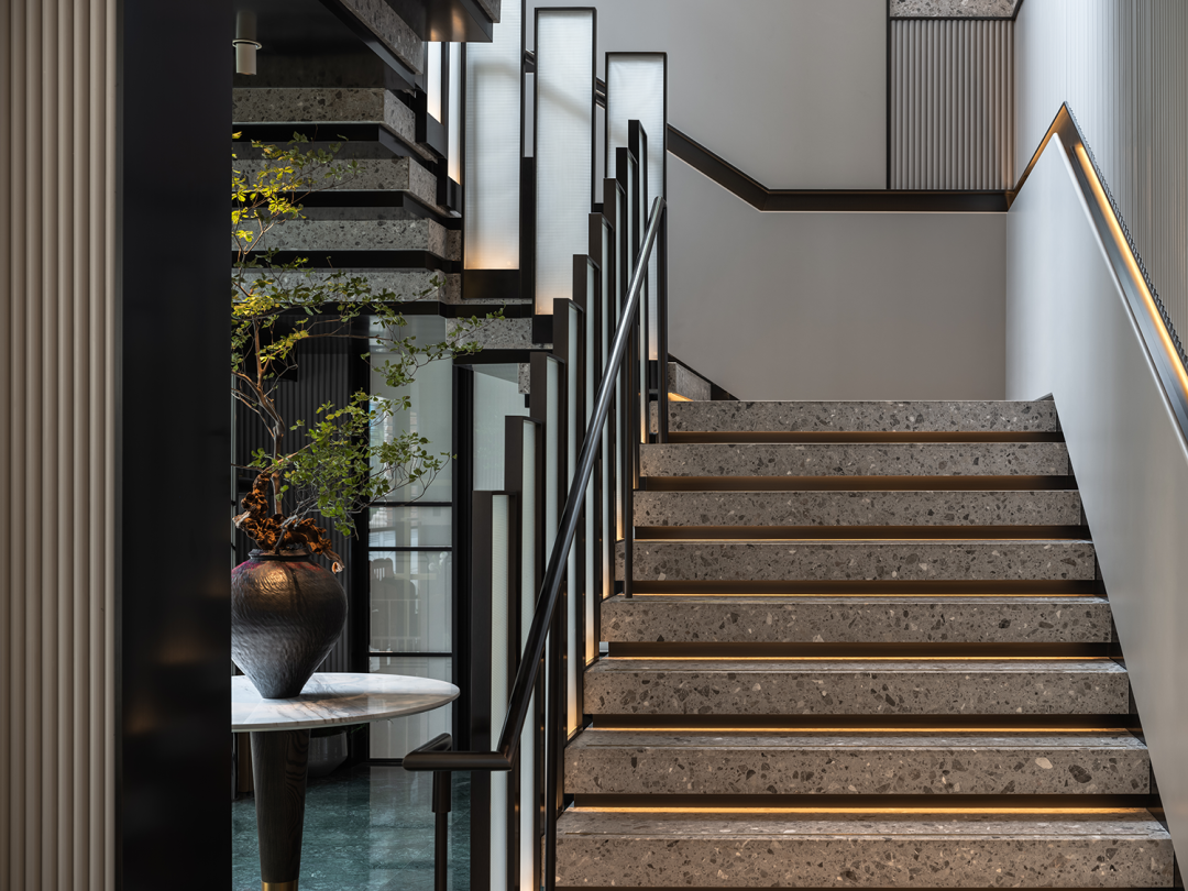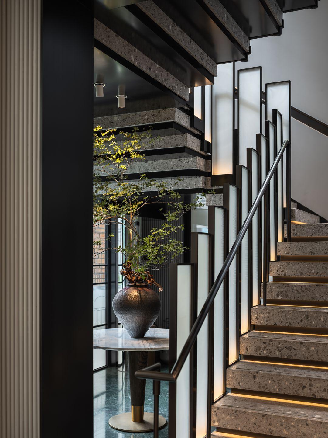 在樓梯工藝上,設計師運用石材的切割和堆疊形成幾何感十足的交通空間,配合錯落有致的、帶有上海印記的鉆石紋藝術玻璃,演繹空間的線條魔法。樓梯自帶深沉溫柔的瑩瑩珠光,拾級而上之時,竟有幾分探訪世外桃源的期待。