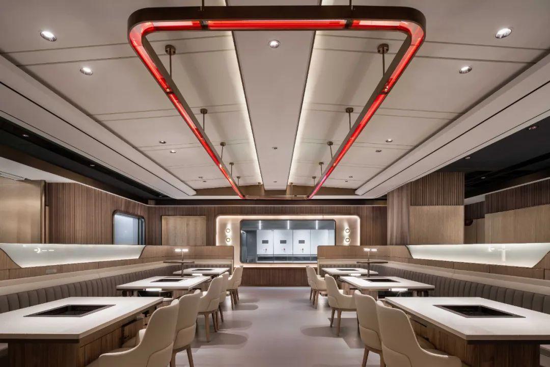 銅質的線性造型分布于餐廳的各個角落,是風景,亦是空間的劃分依據 。線與面的組合、點與線的較量,令室內動線更為流暢,共同鑄就了空間的內建筑感。