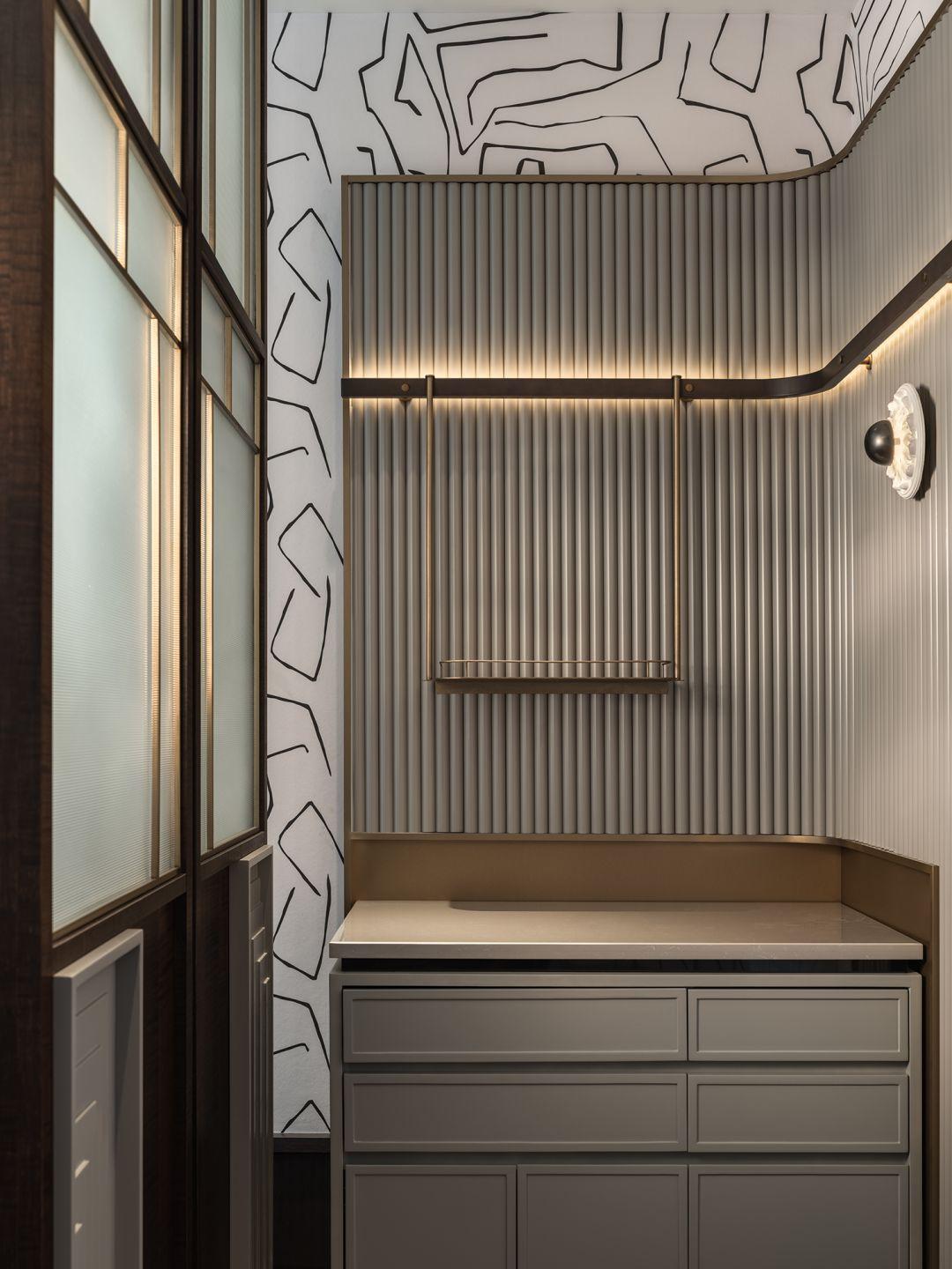 水墨如何增添摩登質感?設計師用現代水墨圖案做壁紙,讓線條流泄一抹靜謐流動的室內氛圍,又不失精致態度。皮革與銅件混搭出優雅柔和的氛圍,讓處于暗處的副空間也剛柔有序、值得回味。