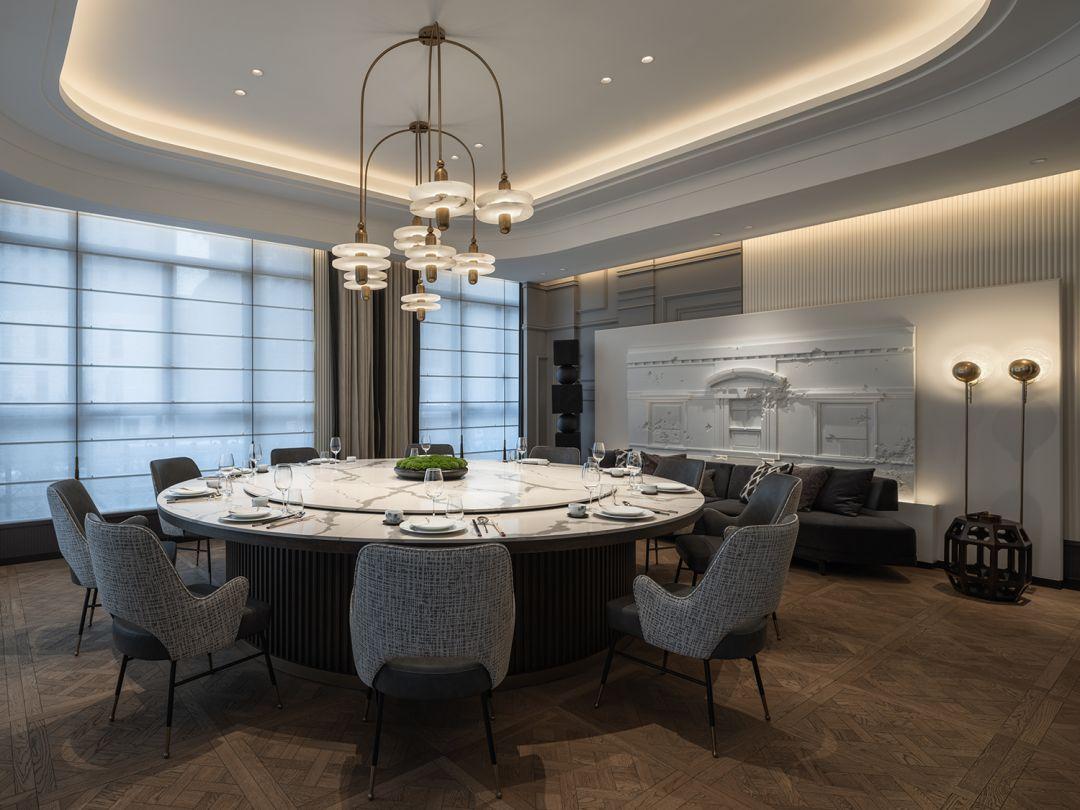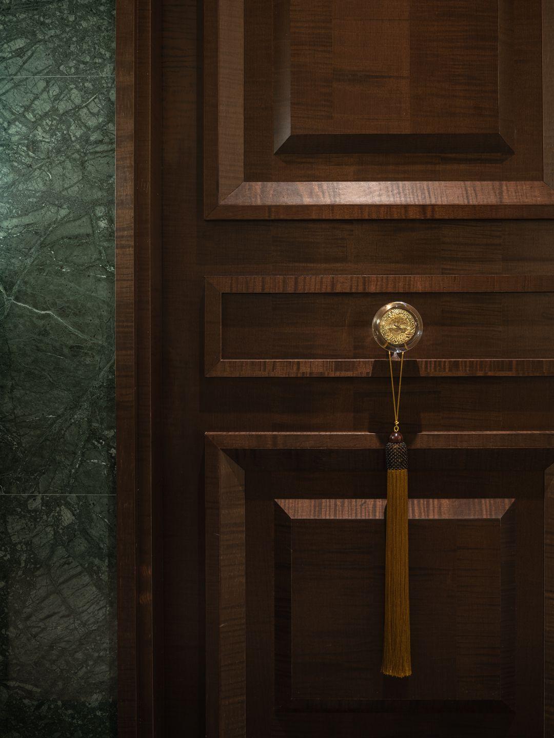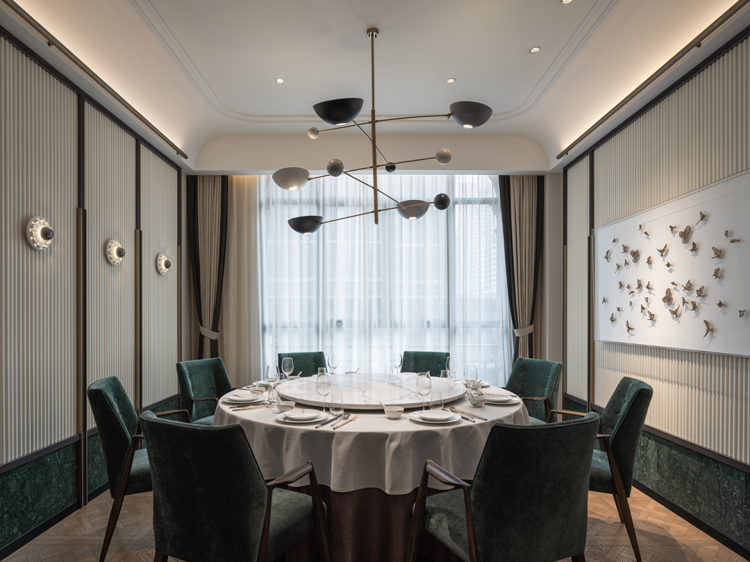 賦予空間以時間感,足不出戶實現時間旅行,這素來是設計師的夢想。海藻綠大理石與深木紋門戶,帶來了裝飾主義的西方格調,靜穆而愜意。推開門,即將步入奢華而私密的專屬用餐空間。