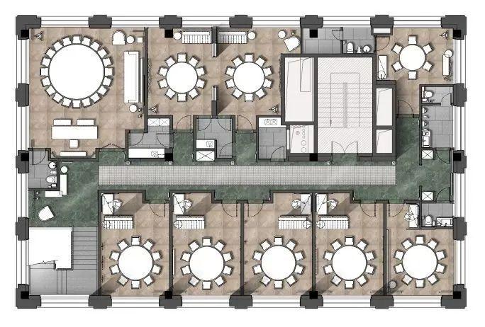 墨綠色、卡其色、米色等空間色調混搭點綴于這個主題包廂,利用色彩的些微轉換,巧妙圍塑出雋永的空間視感。