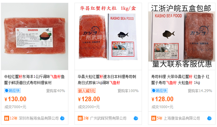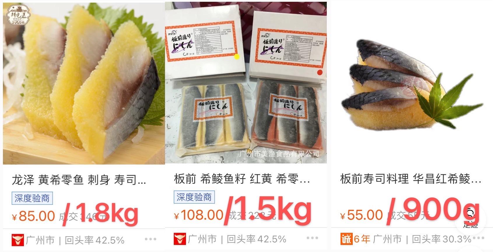 5.希鯪魚希鯪魚是使用青花魚+多春魚魚籽的合成產品。1688上查到的價格是45-70/1kg,在日料店里吃一份的價格直接就可以買個1kg了。這種合成肉價格比豬牛肉還低。