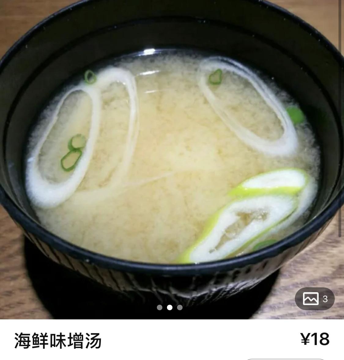 海鮮味增湯=出汁粉+味增+蔥+幾坨蛤蜊肉。一丟丟蛤蜊肉泡在粉沖出來的湯里,身價直接升到逼近20。