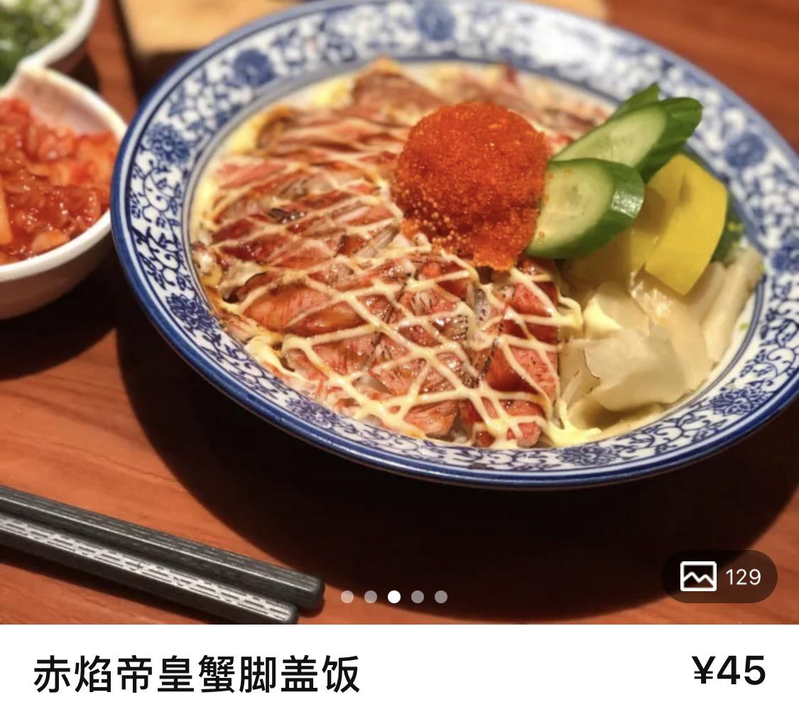 2.火炙 / 炙烤的菜品赤焰帝皇蟹腳蓋飯=飯+兩片青瓜+成品泡姜和黃蘿卜+飛魚籽+合成肉蟹腳+美奶滋,然后拿噴槍炙烤一下。