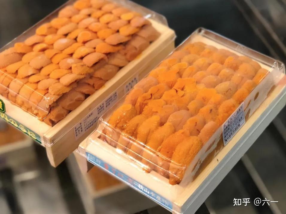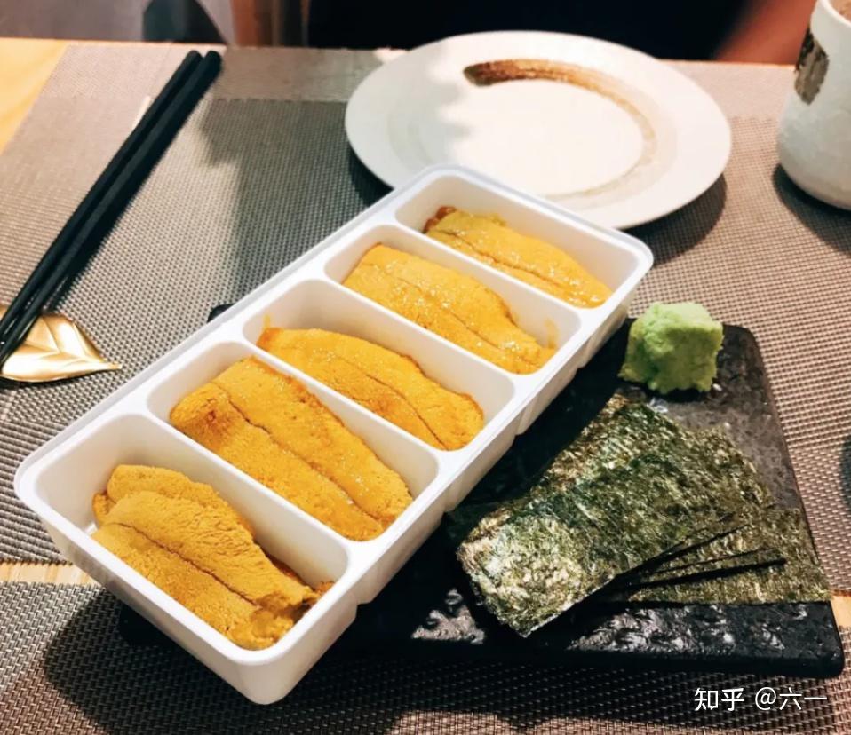 有些日料店喜歡擺一些看起來逼格很高的木盒裝海膽,木盒比塑料盒保溫更好,一般用木盒裝的海膽品質更好一些。不過其實價格也沒有很貴,國產的價格100-165塊/100g: