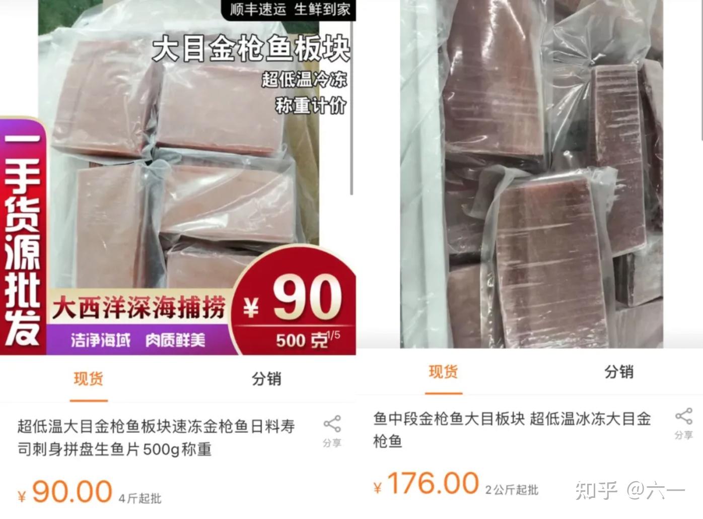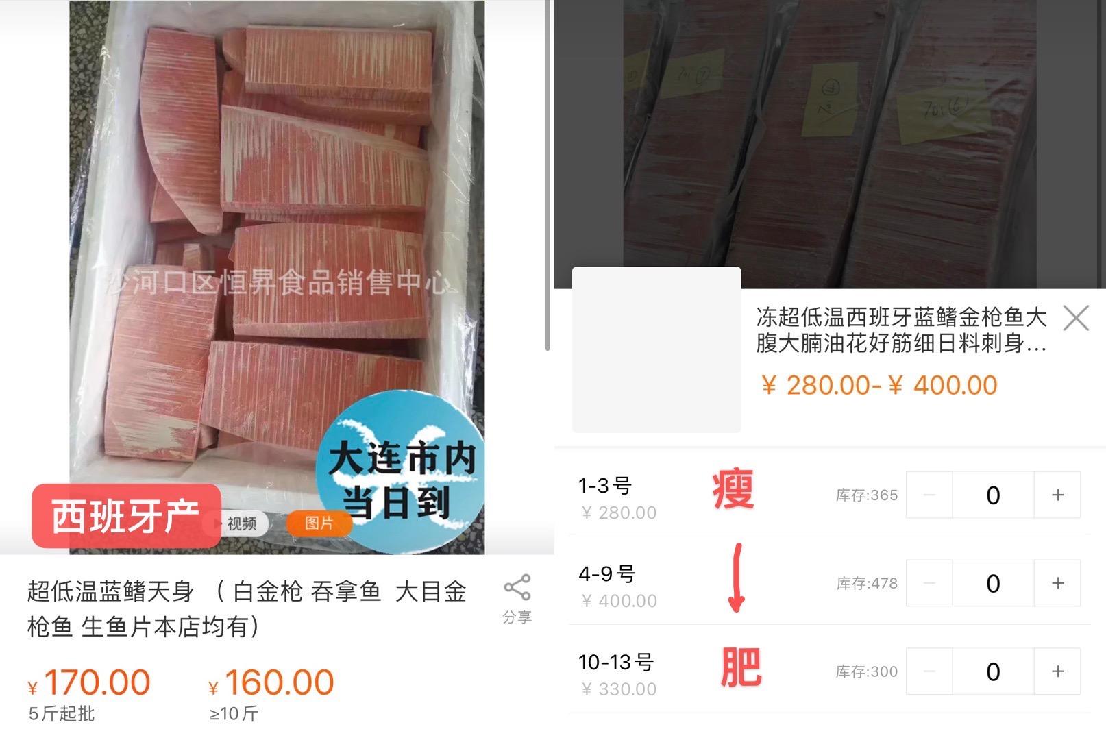 在B級日料店里沒有標注是『藍鰭金槍魚』的菜品一般用的是用超低溫的黃鰭 / 大目金槍魚塊,黃鰭的價格在50元/斤,大目的價格是80-100元/斤。