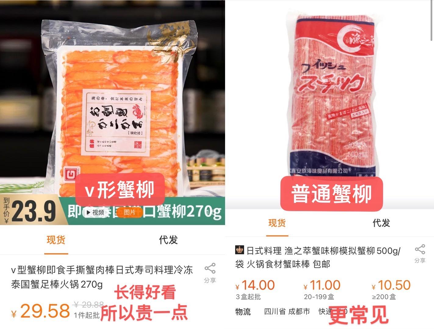 判斷圖上這個“帝皇蟹腳”是合成肉很容易,一是以45塊錢根本吃不到這么多真·帝皇蟹腳,人工剝殼費都不止;二是帝皇蟹腳的形狀和紋理都不長這樣。大概率就是用的做成蟹腳肉形狀的v形蟹柳: