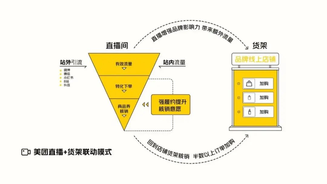 四是引流玩法變化:站內外資源投放+明星助陣直播,站外,美團外賣在微博、微信、小紅書、B站、抖音等熱門平臺種草,與站內流量形成合圍,賦能于直播間引流。