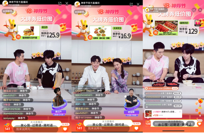 二是消費路徑變了:將商品券作為全新載體,實現餐飲的“可囤貨”。消費者在直播間搶到商品券后既可以選擇立刻下單核銷,也可以“囤起來”方便以后使用。商品券模式還能夠為商家帶來額外的增長:很多消費者核銷商品券時往往會順手再多點一些商家貨架在售的其他商品。數據統計顯示,平均每張商品券能夠額外帶動商家貨架50%的交易額增長。