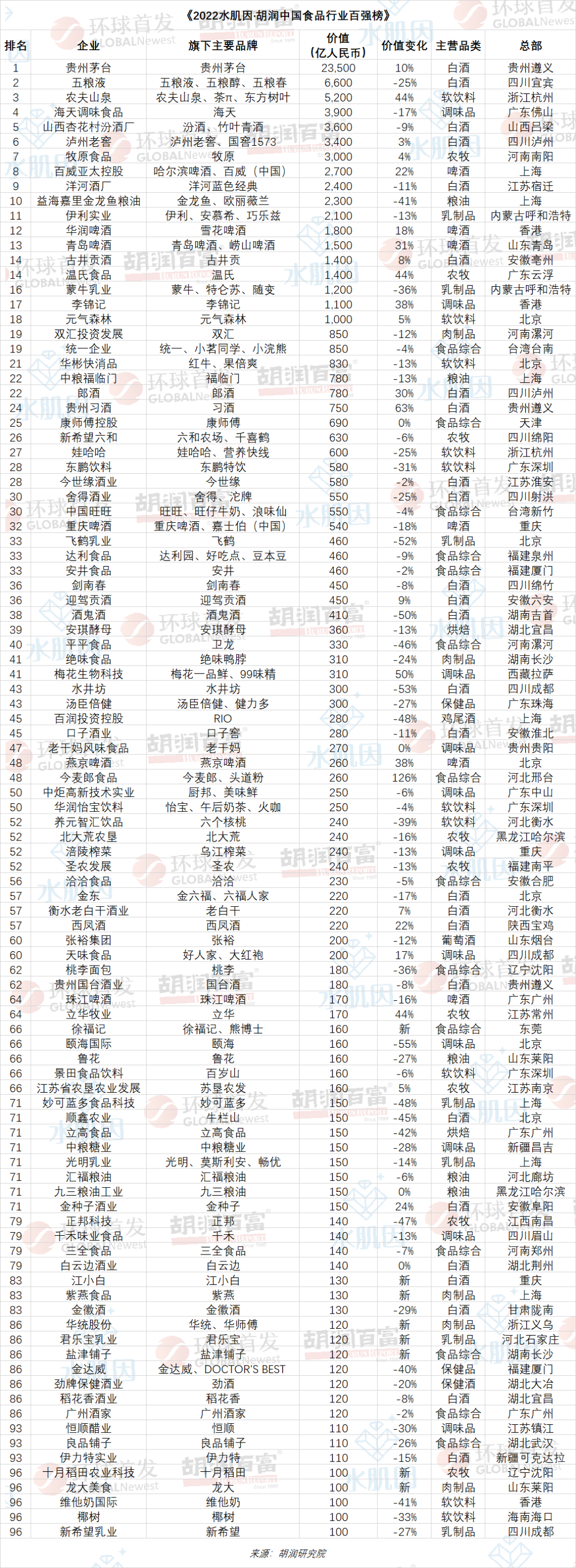 (數據來源:2022水肌因·胡潤中國食品行業百強榜)