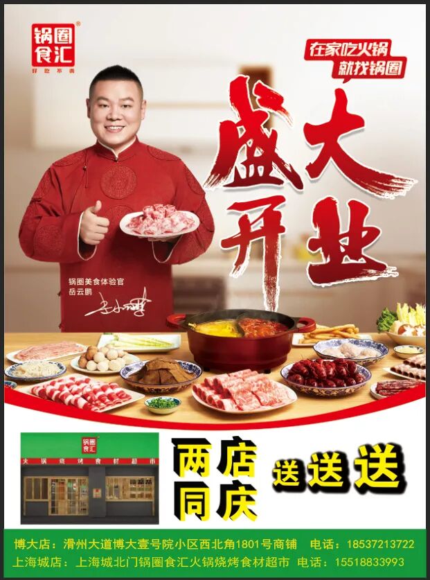人氣爆棚 門庭若市 全國連鎖有5000+門店 是火鍋燒烤食材行業的領軍品牌 進軍滑縣市場以來 一直以”好吃不貴”的產品吸引了無數的粉絲 【鍋圈食匯·火鍋采購一站式】 新店開業 福利杠杠的! 01 進店消費送好禮活動 活動期間進店消費 滿98元送小電火鍋一個(20cm) 滿158元送大電火鍋一個(26cm) 滿168元送價值68元不銹鋼鴛鴦鍋一個 滿188元+88元送價值158元多功能電烤盤一個 02 免費注冊會員領取食鹽 03 參與留言有機會領取禮品 參加文末留言活動 前10名點贊精選進店領取 黃桃罐頭一份(僅限開業期間) 04 進店加好友轉·發免費領火鍋底料 到店加好友轉·發門店朋友圈 連續3天(早晚各一次) 開業期間進店免費領取 價值10元火鍋底料一份 05 活動期間每天免費領66份雞蛋 活動開業期間 每天早上9:30分免費領雞蛋 每天66份,每份6個 先到先得;送完為止 活動時間:11月20日--22日 地址一 博大店:滑州大道博大壹號院小區西北角1801號商鋪 地址二 上海城店:上海城小區北門27#樓2#商鋪 電話:15518833993 無論是純正的重慶牛油底料 鍋圈食匯統統都有! 在鍋圈食匯都能找到你中意的那款味道 這里擁有400+種火鍋+燒烤食材 光有肉哪兒能行 毛肚、黃喉火鍋必備也得安排上 獨立包裝 安全放心又衛生 鍋圈食匯家的毛肚涮后 鮮嫩脆彈、口感緊實 這就是鍋圈食匯的品質 蟹籽包、魚豆腐、蟹肉棒、甜不辣... 你喜歡吃的海鮮丸類全都有 你需要的它都有! 低溫保鮮狀態下也保持原汁原味 除了懶人燒烤還有懶人火鍋 聽說你家里沒有鍋? 沒關系,這里有各種大小鍋任你挑選 單人鍋、鴛鴦鍋、燒烤爐…… 關鍵是可以租! 別忘了活動時間 電話:18537213722 地址:滑州大道博大一號院西北角 ▲點擊上方卡片即可導航至博大店 電話:15518833993 地址:上海城小區北門27#樓2#商鋪 ▲點擊上方卡片即可導航至上海城店