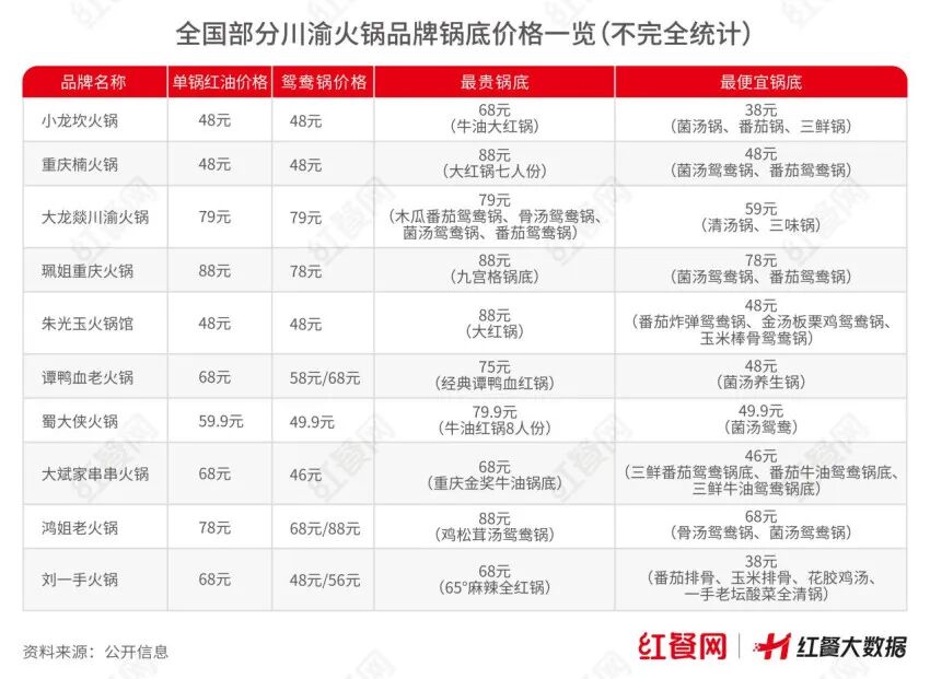 價格方面,以鍋型選擇比較多的海底撈為例,其最貴的是“經典麻辣鍋底”,單鍋(約2000克)99元,拼鍋(約1000克)66元,四宮格(約550克)為35元。而依據不同規格選擇,最便宜的鍋底也有所不同。最便宜的單鍋“三鮮火鍋”61元;拼鍋為“番茄火鍋”,32元;四宮格為“海南黃燈籠椒酸辣鍋底”26元。固定鍋型的火鍋品牌,比如巴奴,其最貴的鍋底組合為“大鍋的牛油辣+酸蘿卜豬肚+野山菌湯”,售價88元,最便宜組合為“小鍋的清水+骨湯+野山菌湯”,售價45元;慫火鍋鍋底則是1-3人量售價均為48元,4-6人量售價均為68元。顧客自行選擇鴛鴦鍋或全鍋的鍋底,價格則從最便宜的38元到最貴的88元不等。