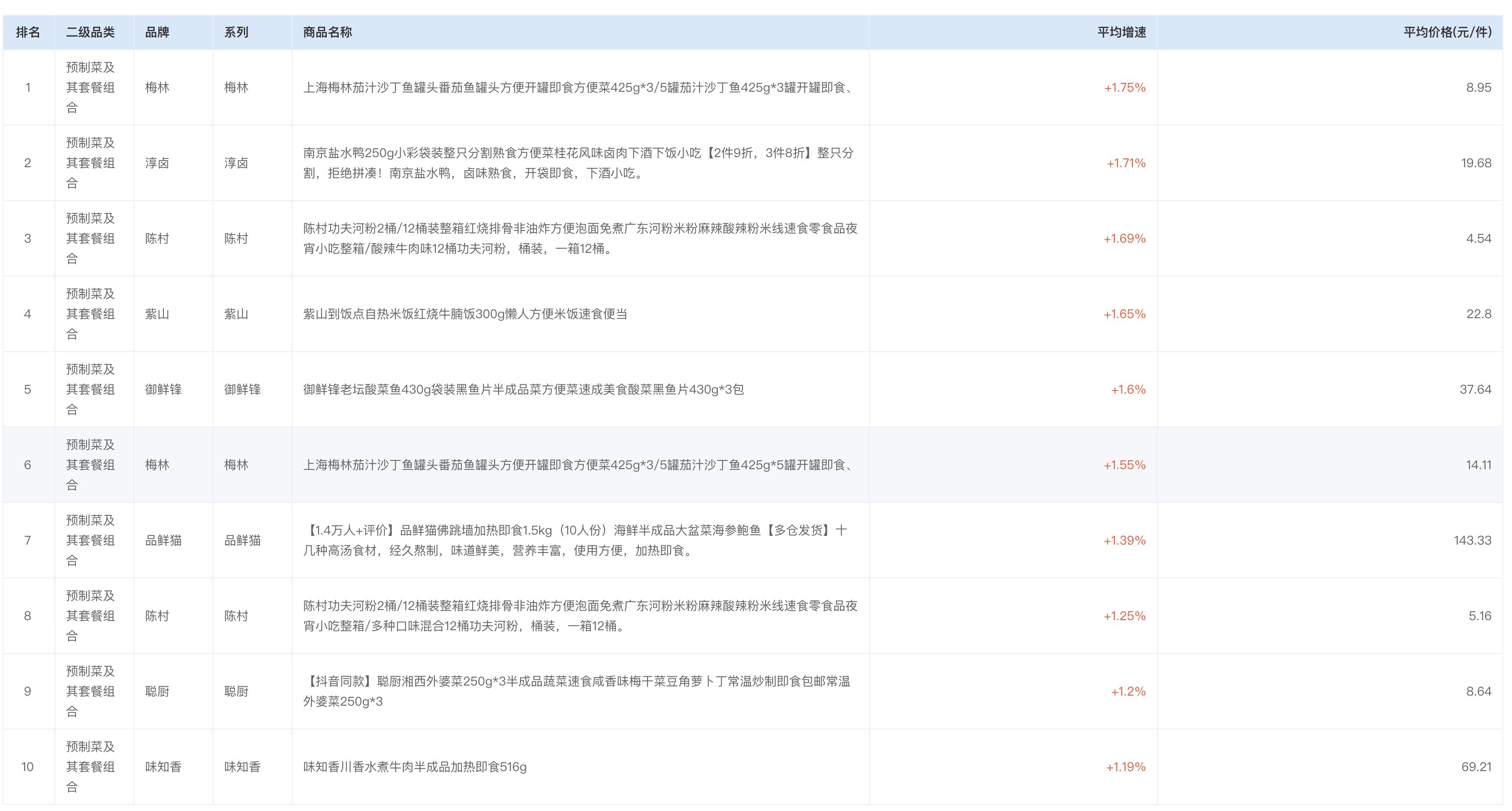 目前在全國2-3月電商受疫情影響的下滑趨勢中,保持增長的熱門商品主要是紫山、梅林、淳鹵、品鮮貓、聰廚、御鮮鋒、味知香、陳村的產品,具體包括: