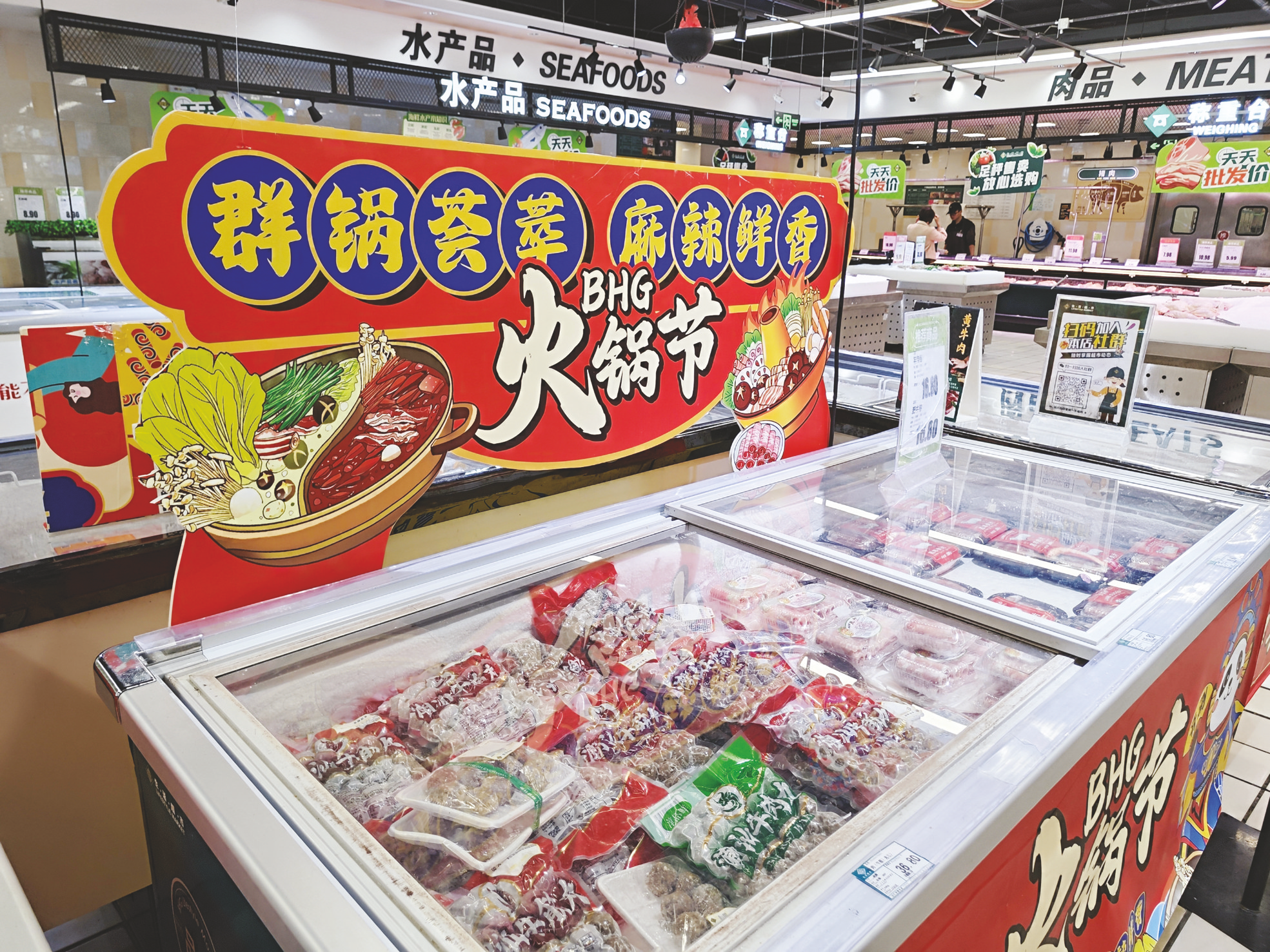 記者走訪南寧部分超市發現,一些商家還設置了“火鍋節”專區。在北京華聯超市江南店火鍋食材專區,“群鍋薈萃、麻辣鮮香”等“火鍋節”的氛圍營造讓人看了垂涎欲滴。羊肉卷、牛肉卷、肉丸子等火鍋食材占據“C位”,種類非常豐富,價格也比較親民,羊肉卷、牛肉卷200克裝的價格在20元左右。銷售員介紹,天氣轉冷后,肉卷和肉丸火鍋食材銷量不斷上升。