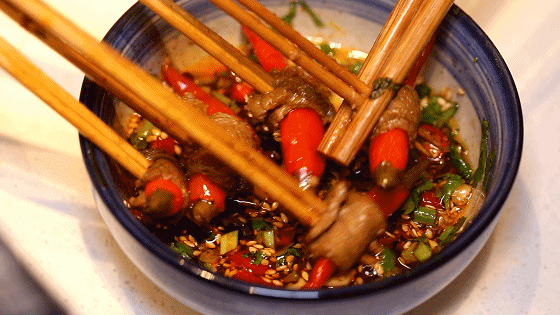 在地道的牛油鍋底中沸騰15秒后,泡椒的酸辣、紅油的麻香與純正牛肉的嚼頭三種滋味在口中一齊迸發,辣到額頭微微出汗,情不自禁喊出一個“爽”字。