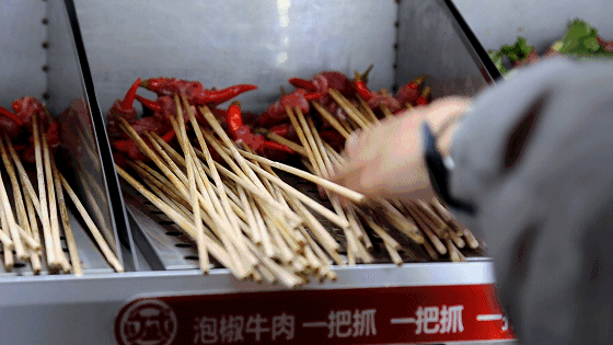 若非嗜辣之人也可自創一種“微辣”口味,將牛肉與泡椒從竹簽剔至碗中,牛肉蘸上自制調料,再咬下一點泡椒尖,泡椒中的湯汁順勢流入口中,咸香酸辣口感兼具。