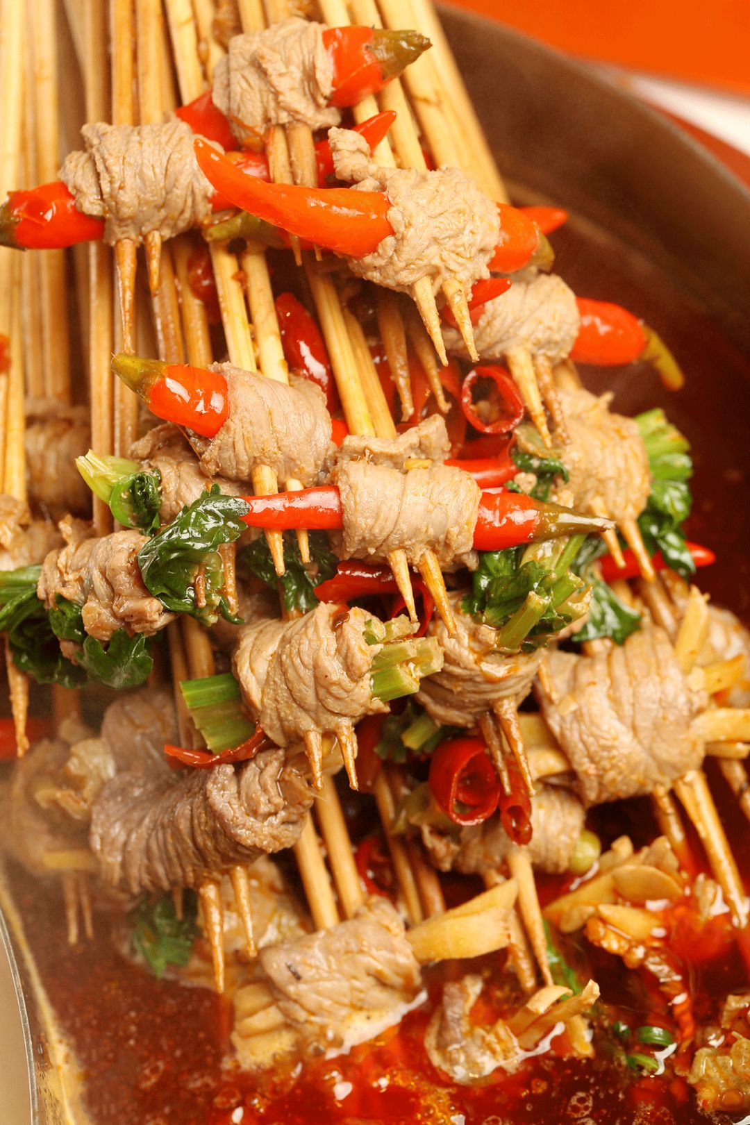 姜絲牛肉原是一道川蜀名菜,在大斌家以串串的形式呈現,爽口姜絲的襯托下,更顯出牛肉的鮮香。