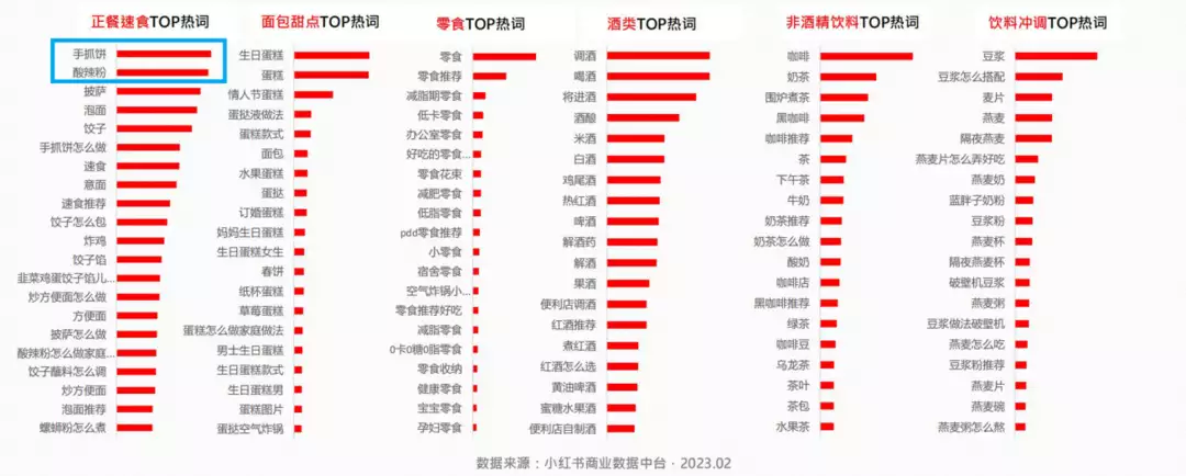 在小紅書發布的《2023年2月食品飲料行業月報》中,酸辣粉在正餐速食TOP熱詞中排名第2。