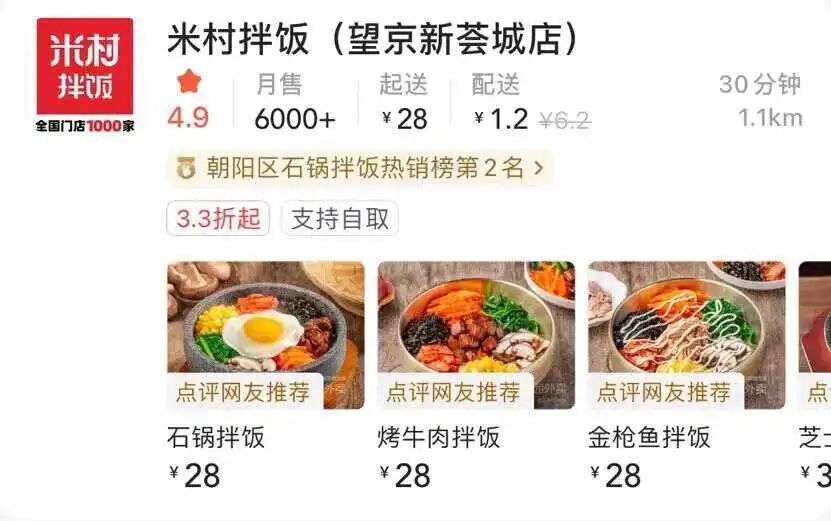 最近,在北京上班的內參君打開外賣軟件,發現公司坐標三公里以內,就有6家米村拌飯,其中4家門店月售達到1000+。另外,望京新薈城店月售則達到6000+,門店銷量第一第二分別是烤牛肉拌飯、石鍋拌飯。
