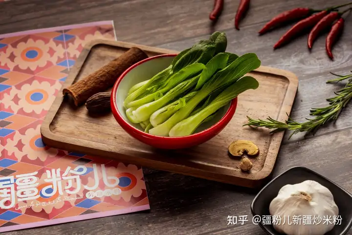 如果不特意交待的話,新疆炒米粉默認以芹菜為配菜。有很多小伙伴不喜歡芹菜,是堅定的“反芹菜”者,所以疆粉兒在傳統的新疆米粉上做了改良,增添了更多的配菜選擇,鮮嫩清爽的小白菜,酸香爽口的泡菜,爽脆嫩滑的金針菇。