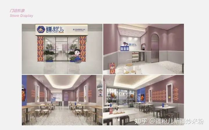 我們是特色美食,特色的裝修是吸引顧客的第一步。我們用疆粉兒logo展示招牌,門口再放一個立體logo人像,門柱和室內都貼有民族特色花紋貼紙,把特色展現得淋漓盡致,和新疆炒米粉相得益彰。
