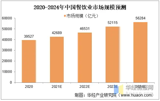 隨著國內外賣服務能力提升,以及居民消費實力的增長,進一步鞏固了我國餐飲業的規模擴張。疫情加速各行各業的數字化業務進程,餐飲業也不例外。疫情嚴防嚴控時期,線下門店關閉、限堂食,餐飲企業向線上轉型,通過搭建數字化平臺、加強/開辟外賣業務、直播帶貨、社群營銷等一系列舉措,在短短幾個月,打開了餐飲行業的一片新天地,線上業務營收實現大幅大幅增長,成為疫情期間企業重要收入來源。隨著線上市場的高速發展,我國餐飲業市場規模也能保持穩定上升的趨勢,預計2024年我國餐飲業市場規模增至56284億元。