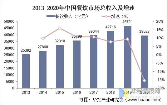 中國餐飲行業伴隨經濟發展,不僅成為人民生活水平和消費能力提升的見證,也逐步成為擴內需、促消費、穩增長、惠民生的支柱產業。2013-2020年我國餐飲市場總收入逐年上升,但近幾年的增速有所下降,2019年為9.4%。疫情影響導致餐飲行業發展受限,2020年我國餐飲行業收入首次出現負增長,為39527億元,同比下降15.40%。