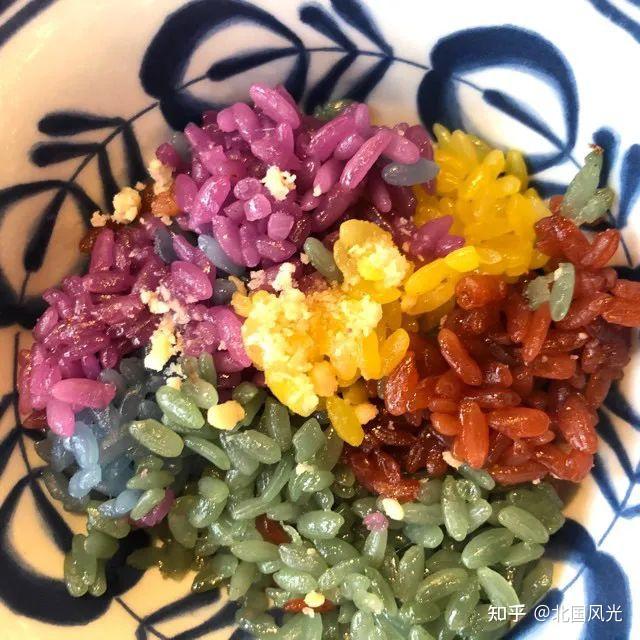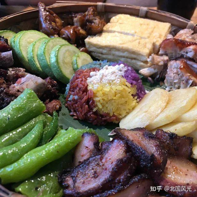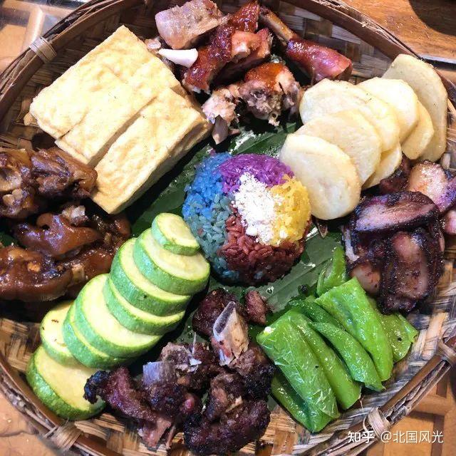 先來傣族的手抓飯,五色米飯,配以各類烤時蔬和烤肉、豆制品,色彩斑斕,口感層次豐富。