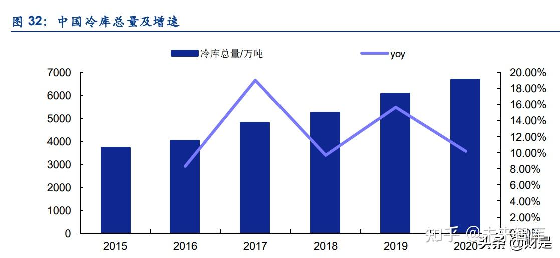 隨著冷鏈物流需求增長,基礎設施及服務能力逐步完善。冷庫容量近年來也呈兩位數增長, 2019 年冷庫總量達 6053 萬噸,同比增長 15.6%,2020 年則達到 6665 萬噸,同增 10.1%。