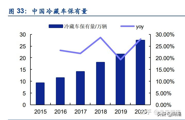 我國冷藏運輸的方式主要有公路、鐵路、航空和水路四種,其中以公路冷藏運輸為主。冷 藏運輸環節是冷鏈物流的重點環節,冷鏈的快速發展必須要投入大量的冷藏車。2015 年我 國冷藏車保有量為 9.34 萬輛,到 2020 年冷藏車保有量為 27.5 萬輛,CAGR 達 24.1。銷量則從 2015 年的 1.96 萬輛增長到 2020 年的 6.72 萬輛,CAGR 達 27.9%,且 2020 年同比 增速達 39.3%。