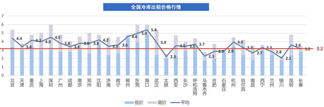 對全國多個城市的冷庫租金平均價格進行梳理,以3.2元/平米/天設置預警線,大部分城市的均價可以滿足回本要求,但是大多數低價只能覆蓋可變成本,無法覆蓋固定成本。