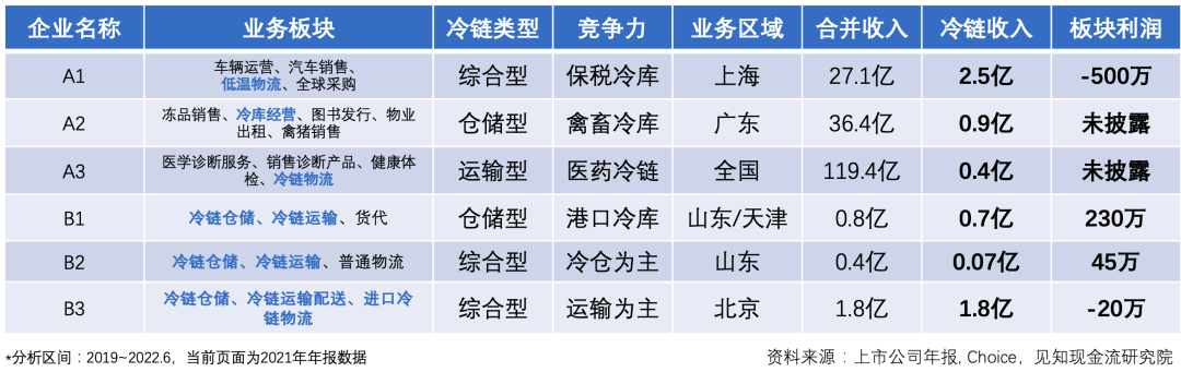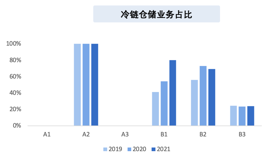 我們選擇了三家披露其冷鏈板塊相關數據的A股上市公司,并在新三板中選擇了三家冷鏈物流企業,選擇的標準是以冷鏈物流業務為主,提供第三方服務,并且不是物流信息平臺類企業。同時,我們在冷鏈板塊相關的收入和成本中,剔除了貿易因素。