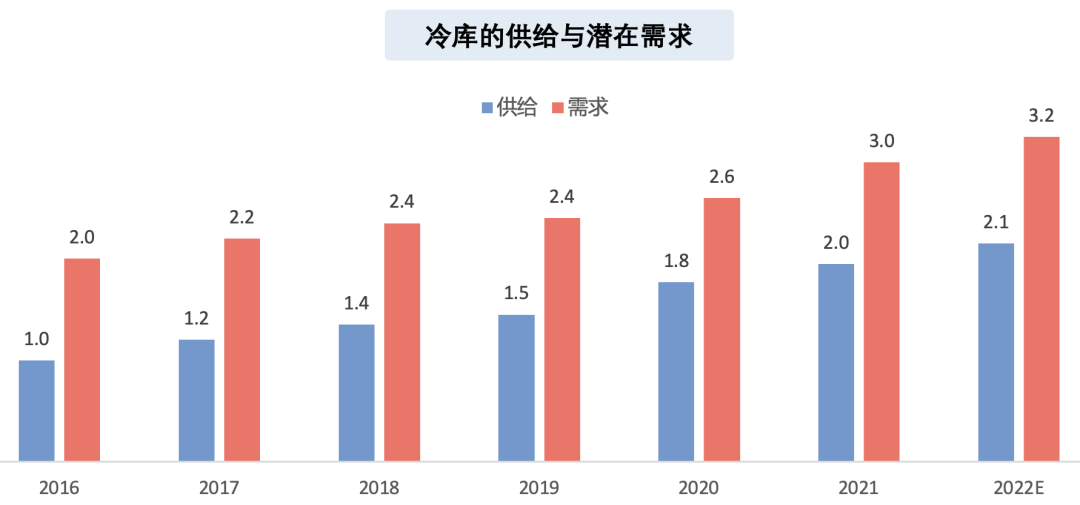 以冷庫為例,2021年我庫容量突破1.95億m3,而潛在需求約為2.95億m3。冷庫的建設同時需要一定的資金和技術,在短期內難以快速提升;參考供需兩端的發展增速,預計冷鏈物流服務供給端相對不足的情況將長期存在。